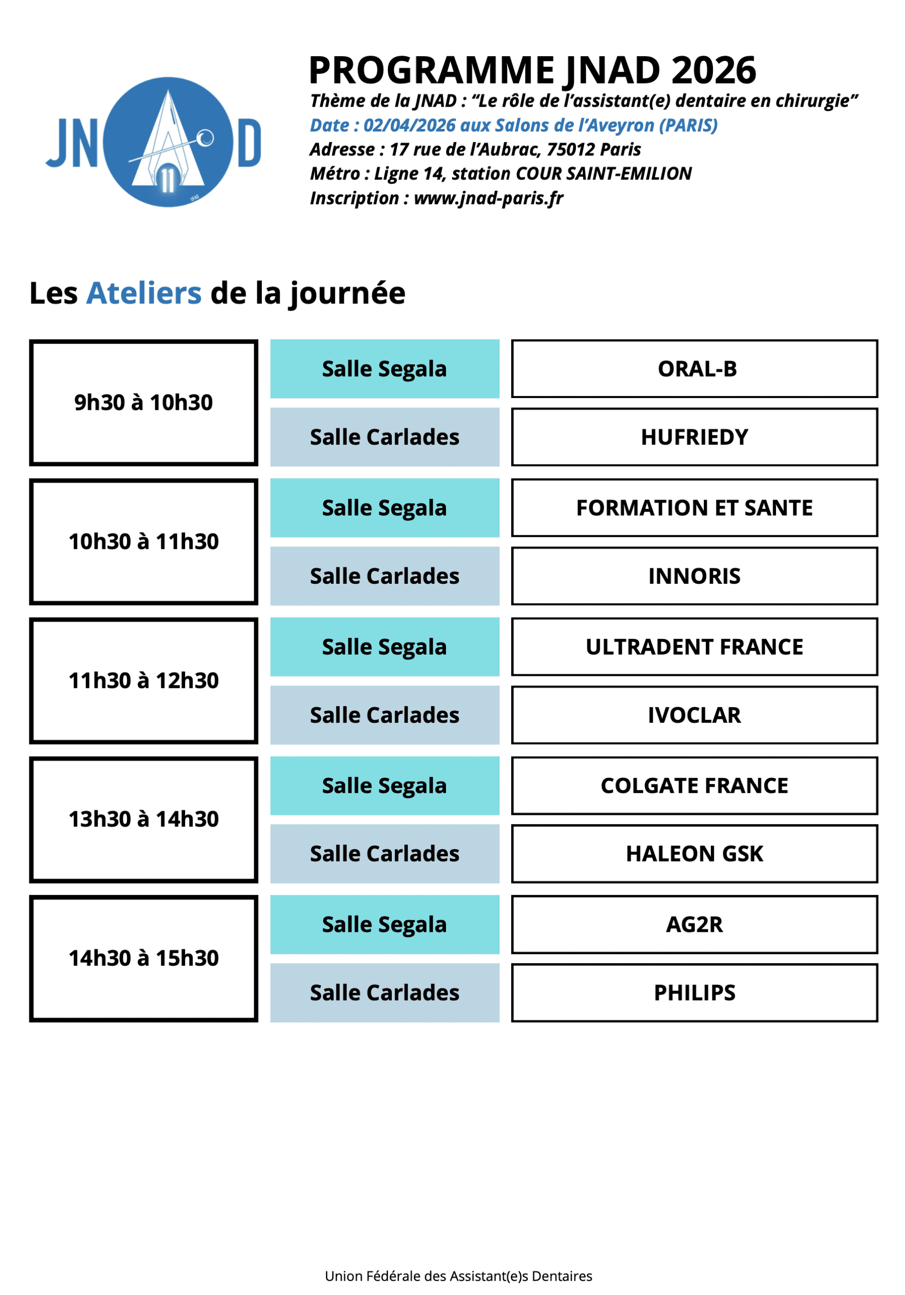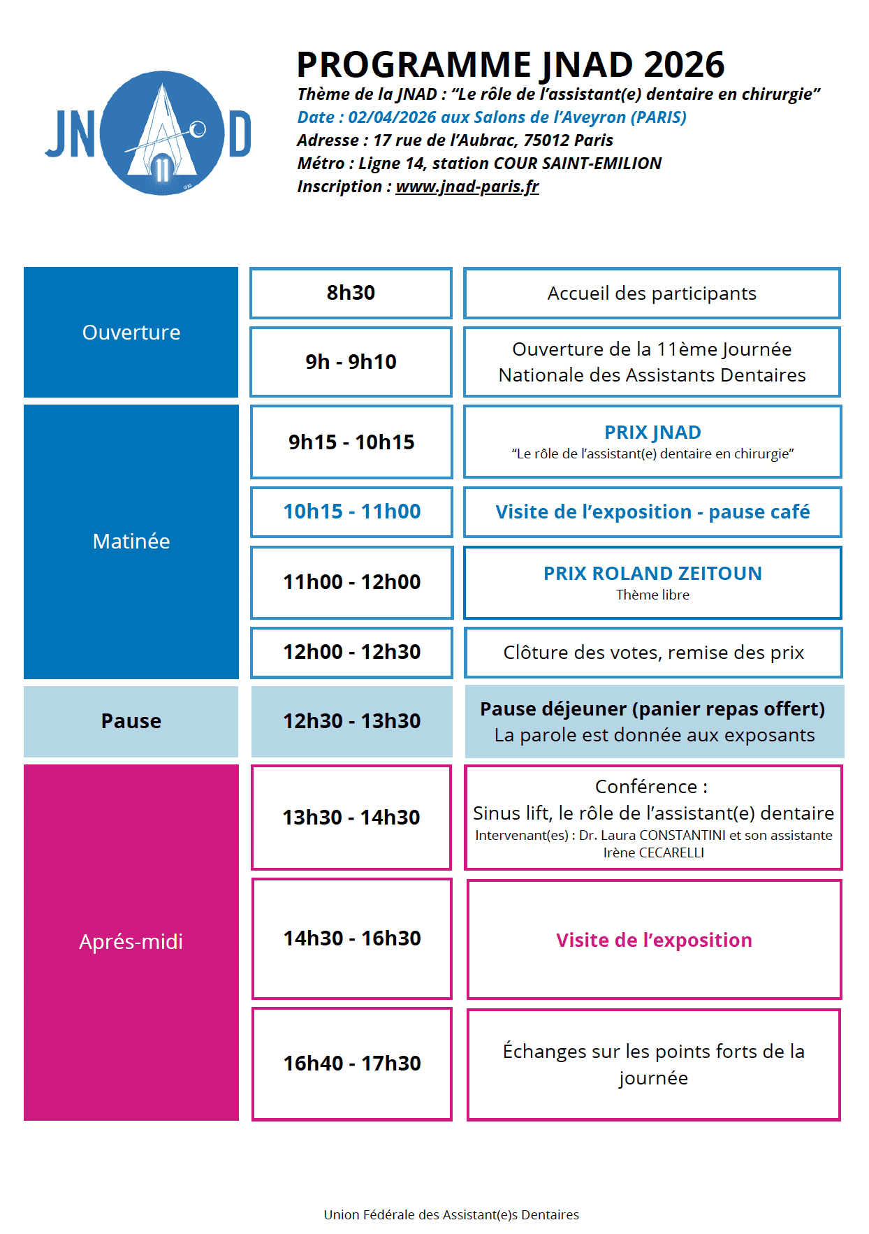 La Journée Nationale des Assistants Dentaires (JNAD) a lieu comme les année précédentes aux Salons de l’Aveyron dans le site de Paris Bercy, 17 Rue de l’Aubrac, dans le 12ème arrondissement de Paris. Le but principal de cette journée est de permettre aux assistants de se sentir reconnus et majeurs, le second est la possibilité de se réunir dans un espace détendu et convivial qui lui est entièrement consacré. Cette journée d’informations, de découvertes et de rencontres, est devenue au fur et à mesure des années un lieu de formation, de partage et d’amitié. Elle est ouverte également à leurs partenaires dentistes.