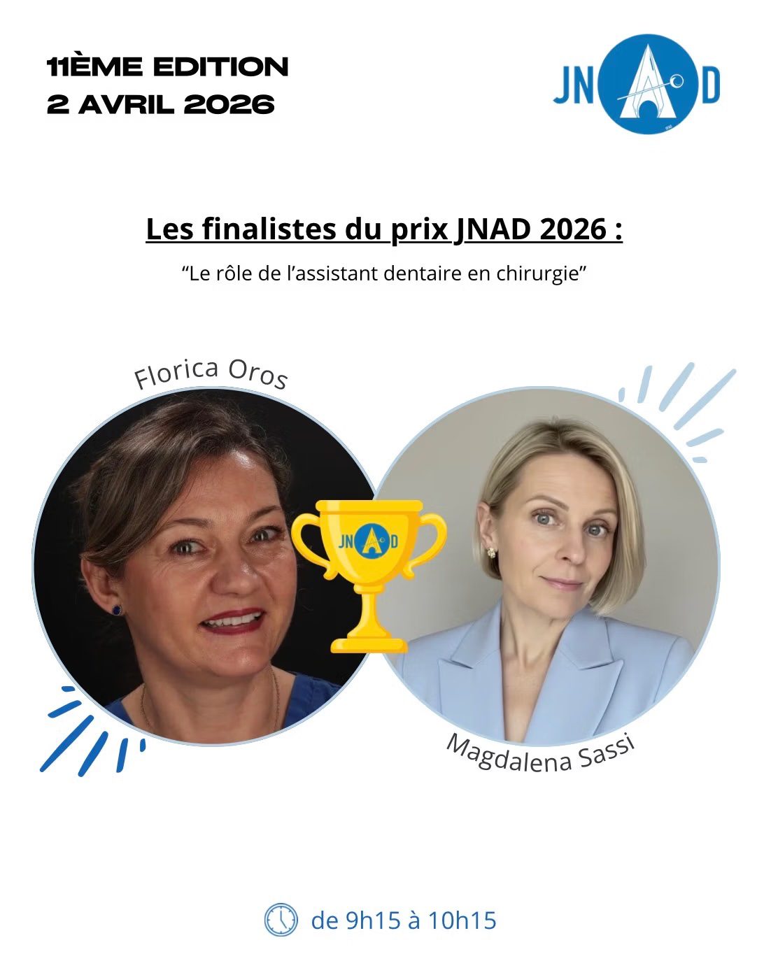 Nous avons l’immense plaisir de vous annoncer les deux assistantes dentaires finalistes sélectionnés pour le Prix JNAD 2026. À cette occasion, elles auront l’honneur de présenter chacune une conférence autour du thème de cette édition : « Le rôle de l’assistant dentaire en chirurgie » À travers leur expertise, leur engagement et leur expérience, elles mettront en lumière l’importance essentielle de l’assistant dentaire au cœur de la pratique chirurgicale. 🏆